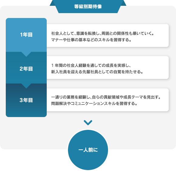 若手社員が定着し、一人前になるまでの3年間を計画的に育成します。
